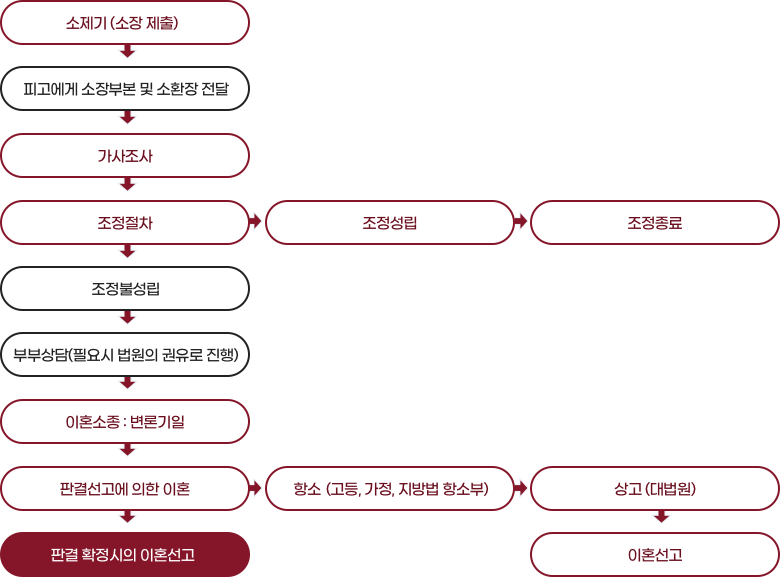 가사소송법은 재판이혼에 조정전치주의 채용하고 있으므로, 이혼을 하려고 하는 자는 우선 가정법원에 조정을 신청하여야 합니다. (가사소송법 제2조 제1항 나류사건 제3호, 제50조). 따라서, 당사자가 이혼소송을 제기하였다고 하더라도 조정이 성립되지 않을 경우나 쌍방 또는 일방을 소환할 수 없는 경우 등을 제외하고 법원이 직권으로 조정에 회부하여야 합니다. (가사소송법 제50조 제2항)